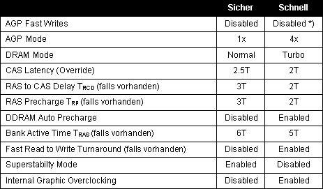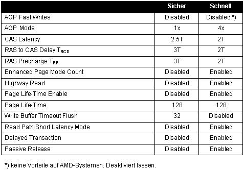 Zuerst einmal sollte man im BIOS die "Optimized Defaults" laden. Diese Einstellungen sind auf den meisten Mainboards bereits sehr gut. Nun sollte man im Chip-BIOS und bei den Integrated Peripherals prüfen, welche Geräte man braucht und welche nicht. Verwendet man zum Beispiel eine PCI-Soundkarte, muß der Onboard-Sound auf dem Mainboard natürlich deaktiviert werden. Ebenso muß es nicht sein, daß die COM-Ports zwei IRQs wegschnappen, wenn man ausnahmslos USB-Geräte verwendet. Auf AMD-Systemen gibt ein paar wenige Optionen, die mit Vorsicht zu genießen sind. Bei Mainboards mit VIA-Chipsatz zum Beispiel sollte man die Optionen PCI Master Read Caching und Delayed Transaction stets deaktivieren. Die ausführliche Begründung dazu findet Ihr hier: http://www.planet3dnow.de/vbulletin/showthread.php3?s=&postid=290787#post290787 . Die Option Delayed Transaction ist so ein Kandidat, der immer wieder Ärger macht, nicht nur auf VIA-Chipsätzen, sondern generell, auch bei Intel-Boards. Daher lieber deaktivieren, zumal der kleine 32-Bit Puffer in der Northbridge lediglich PCI-Karten ein wenig beschleunigt, jedoch kaum meß- und schon gar nicht spürbar. Bluescreens "dank" Delayed Transaction jedoch spürt man sehr deutlich... Ein weiterer Kandidat aus dem Kuriositäten-Kabinett ist die Funktion Fast Writes. Wegen ihr streiten Intel und VIA seit zwei Jahren vor Gericht. Intel sieht Fast Writes als eine eigene Entwicklung, VIA als Teil der Spezifikation. In der Tat war es es so, daß Intel diese Option als erstes eingeführt hat, während VIA die Option nachträglich in ihre Chipsätze/BIOSe hineingeflickt hat. Das ist auch der Grund, warum die Option auf AMD-Systemen nichts bringt, weil sie ursprünglich gar nicht vorgesehen war. Mit Fast Writes könnte der Chipsatz Geometrie-Daten direkt von der CPU zur Grafikkarte schicken ohne Umweg über das RAM, was theoretisch einen kleinen Performance-Vorteil bringen sollte. In der Praxis jedoch hat diese Option auf AMD-Systemen 0.0% gebracht, war im Gegenteil bei einigen OpenGL-Games sogar kontraproduktiv und obendrein kann auch noch die System-Stabilität leiden. Daher deaktivieren. Kritisch auf Mainboards mit VIA 686A/B Southbridge ist zusätzlich noch der ECP/EPP Modus für den Parallel-Port. Viele Drucker spucken nach ein paar Seiten nur noch Datenmüll aus, wenn der IRQ-Miniport Treiber für den VIA-Chipsatz installiert ist. Daher den Parallel-Port Modus bei KT133(A) Chipsätzen auf "Normal" schalten, bei Mainboards mit der AMD761/VIA686B-Kombination auf "SPP". Dann hat der Spuk ein Ende. Im folgenden seht Ihr ein paar Tabellen von weit verbreiteten Chipsätzen mit ihren spezifischen Optionen: AMD 761