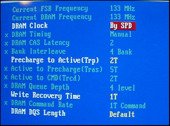 Last but noch least sollte man natürlich auch nicht vergessen, wie emsig der Hersteller seine Produkte pflegt. Wer nach ein paar Monaten eine größere Festplatte nachrüsten will, sie aber nicht nutzen kann, weil der Board-Hersteller nur alle Schaltjahre mal ein BIOS-Update für seine Produkte präsentiert, sitzt erstmal im Regen. KriterienKonfiguration - BIOSDie optimale Konfiguration eines BIOS gibt es nicht. Bei gutem Speicher zum Beispiel sollte es kein Problem sein, die Speichertimings CAS Latency, RAS to CAS Delay (Trcd) und RAS Precharge (Trp) auf die schnellste mögliche Einstellung zu setzen, damit das Board opimal performt. Setzt ein Anwender dagegen, der ein anderes RAM-Modul besitzt, die gleichen Optionen auf "scharf", kann es womöglich Programmfehler, zerstörte Registries oder Bluescreens hageln. Wer gute RAMs gekauft hat wie wir empfohlen haben, kann die automatische Speichererkennung aktivieren ("By SPD"). Damit werden die RAM-Timings exakt so gesetzt, wie im SPD-EEPROM des Moduls vermerkt und es muß sich niemand Sorgen über die Stabilität oder Performance machen. Wer sich der Qualitäten seines RAMs dagegen nicht so sicher ist, sollte die automatische Erkennung erstmal deaktivieren und mit der manuellen Konfiguration untersuchen, ob das System mit den schärfsten Timings stabil läuft. Kommt es hin und wieder zu Programmfehlern, müssen die Timings wieder eine Stufe langsamer gesetzt werden.