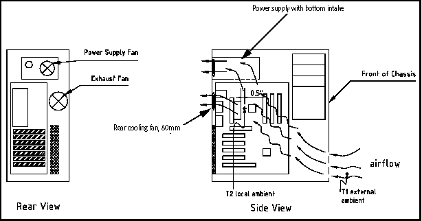 Ein gutes Gehäuse zeichnet ferner ein durchdachtes Modulkonzept aus. Festplattenschächte, die mit einem Hebelklick entfernt werden können, CD-ROM Laufwerke, die bequem eingeschoben werden können und jede Menge Platz für zusätzliche Geräte sind die Kriterien für ein gutes Gehäuse. Natürlich muß es nicht unbedingt ein Gehäuse wie das CS-601 sein, das bereits ohne Netzteil an die 100€ kostet. Es gibt unzählige sehr gute Gehäuse auf dem Markt, die ähnliche Eigenschaften aufweisen. Wir möchten lediglich aufzeigen, daß das Gehäuse sehr wohl ein Kriterium für ein stabiles System ist und es nicht ratsam ist, einfach irgendein Gehäuse zu kaufen, womöglich weil es toll aussieht oder gerade im Angebot ist, wenn dessen Eigenschaften nicht bekannt sind. Ferner möchten wir Upgradern raten, das alte Gehäuse genau unter die Lupe zu nehmen, ob es den gestiegenen Ansprüchen beim Kühlluftaustausch noch gerecht wird. KriterienKomponenten Kauf - NetzteilGerade am Anfang der Athlon-Ära waren Netzteile die Achillesverse eines AMD-Systems. Viele der auf dem Markt befindlichen "Stromlieferanten" waren dem enormen Durst des neuen AMD-Boliden einfach nicht gewachsen. Ein 300 Watt Netzteil solle es sein, hört man und diese Faustregel hat sich bis heute gehalten. Doch dem können wir nicht so einfach zustimmen. Die Qualitäten, die ein Netzteil aufweisen muß, um einen stabilen Betrieb zu gewährleisten, sind zu vielfältig, um sie mit nur einer Zahl ausdrücken zu können.Die berühmten 300 W geben die maximale Gesamtleistung des Netzteils an. Wer jedoch mal ein Amperemeter zwischen PC und Steckdose geschaltet hat, wird ausrechnen können, daß selbst hochgetaktete AMD Athlon Systeme mit schneller Grafikkarte kaum mehr als 120 W Leistung bei Vollast verbrauchen. Wozu dann also ein 300 W Netzteil? Die Gründe müssen also ein wenig komplexer sein und genau das sind sie auch. Ein ATX-Netzteil für einen handelsüblichen PC stellt dem System drei Spannungen zur Verfügung: 3.3V, 5V und 12V. Die Leistung, die für die stromdurstigsten Komponenten Prozessor und Grafikkarte aufgebracht werden muß, beziehen die meisten Mainboards jedoch zum Großteil aus der 5V Schiene, gute Mainboards regeln noch von der 3.3V Schiene hinzu. Die 12V Schiene dagegen, die physikalisch die höchste Leistung liefern könnte, ohne wahnwitzige Stromstärken aushalten zu müssen, versorgt die eher unkritischen Komponenten wie Festplatten und Lüfter. Einige wenige Mainboards mit AGP-Pro Slot zapfen sie wenigstens noch zur Unterstützung der Grafikkarte an. Aber wie wir sehen muß ein Netzteil vor allem auf den 3.3V und 5V Schienen hohe Stromstärken zur Verfügung stellen können. Brauchbare Netzteile schaffen hier 20A auf der 3.3V und 30A auf der 5V Schiene. Niedriger sollte man nicht gehen und je höher die Werte, desto besser. Um nicht ständig mit Ampere-Zahlen und Schienen jonglieren zu müssen, gibt es noch den Begriff der "Combined Performance". Das ist die Leistung, die das Netzteil addiert auf 3.3V und 5V Schiene zu leisten im Stande ist. Hier sind 180 W aufwärts ein sehr guter Wert. Der Grund, warum Pentium 4 Systeme hier nicht so anspruchsvoll sind, ist die Geschichte, die wir bereits in der Historie erwähnt haben. Intel hat für den Pentium 4 die neue ATX 2.03 Spezifikation eingeführt und speist das System zusätzlich noch aus der 12V Schiene. Damit sinken die Stromstärken auf den anderen beiden Schienen und das Netzteil arbeitet "entspannt" vor sich hin, hat sogar noch Reserven um Spannungsschwankungen spielend auszugleichen. ![]() Augen auf beim Kauf! Auf die rot umrandeteten Daten kommt's an. Dieses Netzteil ist wie man sieht beinahe schon Luxus. Spannungsschwankungen sind im übrigen gleich das nächste Stichwort. Anfangs hatten die Mainboard-Hersteller noch das sogenannte Stop Grant Disconnect Bit aktiviert. Damit wurde die CPU bei Leerlauf oder Teillast in den Halt-Modus versetzt. Hier konsumiert zum Beispiel ein Athlon 1400C statt 72W nur noch 5W. Man kann sich leicht vorstellen, wie streßig es für die Spannungsregler sein muß, permanent und mit hoher Regelgeschwindigkeit diese Schwankungen auszugleichen. Selbst für ansonsten brauchbare Netzteile war das oft zu viel des Guten. In diesem Fall reagierten die Systeme im Teillastbetrieb häufig mit Freezes oder spontanen Reboots. Mittlerweile haben die meisten Mainboard-Hersteller den Halt-Modus wieder deaktiviert. So eiert die CPU zwar auch dann mit Volldampf vor sich hin, wenn es gar nichts zu tun gibt, aber wenigstens verabschiedet sich das System nicht spontan in die Mittagspause. Ein weiteres Kriterium für ein Netzteil ist sein Grad der Beteiligung an der Kühlung des Gehäuseinnenraums. Wie wir auf der letzten Seite gesehen haben, sieht das AMD-Konzept eine Absaugung der Warmluft direkt über dem Prozessor vor. Viele Netzteile jedoch saugen die Luft lediglich an der Rückseite ab (linkes Bild). Damit können in der Region um den CPU-Sockel herum Hitzenester entstehen, wenn man die Heißluft nicht mit einem Gehäuselüfter nach draußen befördert. Andere Netzteile dagegen besitzen zusätzlich noch einen Lüfter an der Unterseite (rechtes Bild) und geben Hitznestern damit kaum eine Chance, selbst ohne Gehäuselüfter.