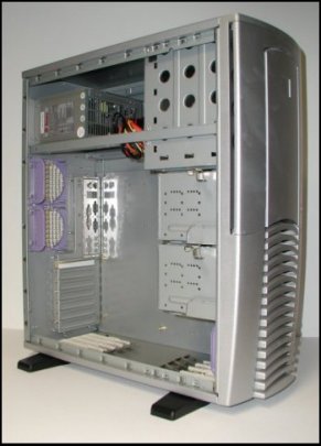 Wie man auf dem rechten Bild sehen kann sind an der Rückseite Aufnahmen für zusätzliche Gehäuselüfter vorgesehen, die den Luftstrom weiter beschleunigen und damit einen noch besseren Luftaustausch erzeugen.