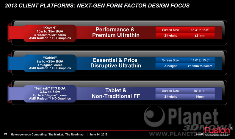 17:14 - Autor: Dr@WCCFtech hat einen Ausschnitt aus einem offenbar von AMD stammenden Produktleitfaden veröffentlicht, der einen Überblick über AMDs 2012-Desktop-Plattform geben soll. Neben den bereits bekannten APU-Modellen, die auch bereits in der freien Wildbahn gesichtet wurden, sind auch die ersten drei neuen FX-Prozessoren (Codename "Vishera" bzw. Orochi Revision C0) aufgeführt. Demnach würde das neue Spitzenmodell AMD FX-8350 mit acht Piledriver-Kernen (8 Integer-Kerne bzw. 4 Module) einen Basistakt von 4,0 GHz aufweisen, der im Turbomodus auf 4,2 GHz angehoben wird und dabei eine Leistungsaufnahme von 125 Watt (TDP) nicht überschreiten soll. Zudem wäre wohl der Sechskerner AMD FX-6300 (3,5 GHz / 4,1 GHz) und der Quad-Core AMD FX-4320 (4,0 GHz / 4,2 GHz) mit einer TDP von 95 Watt in Vorbereitung.