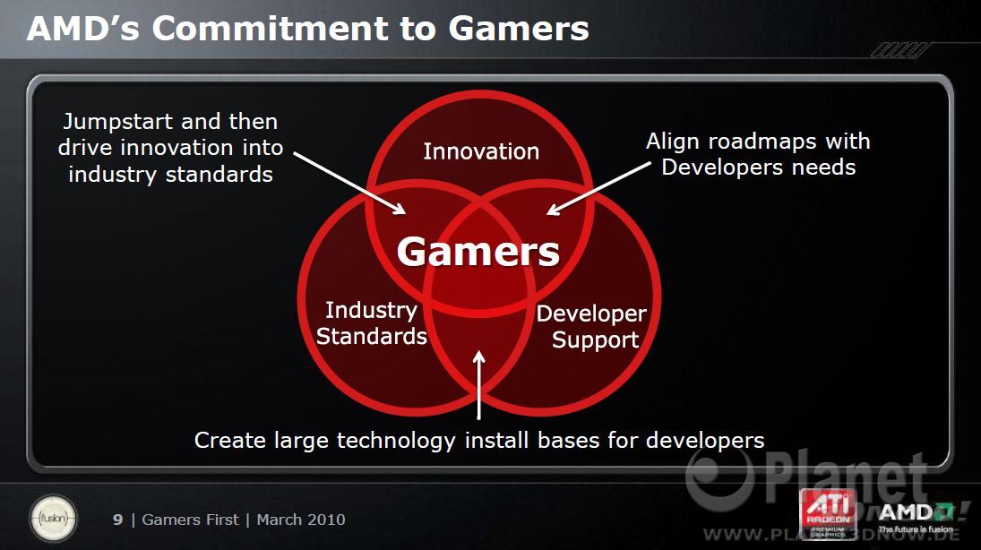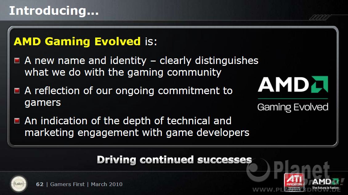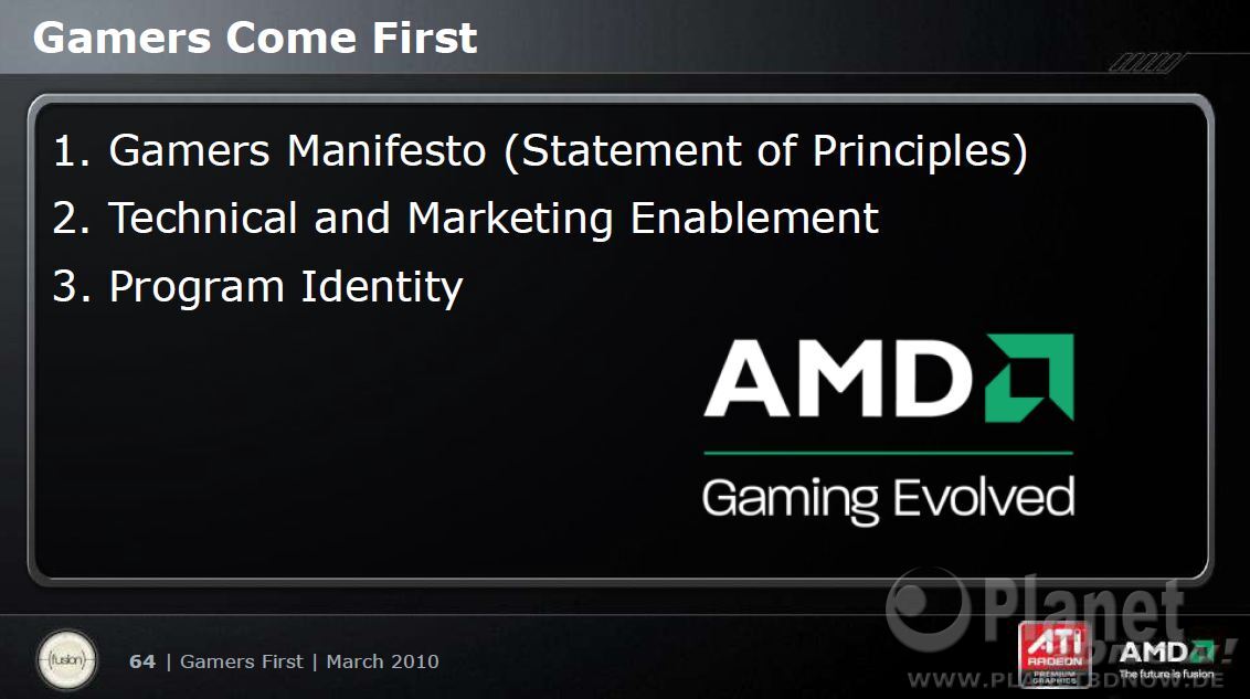Das Gegenstück zu Nvidias „The Way It's Meant to Be Played” hat jetzt einen Namen bekommen. Das Entwicklerprogramm von AMD läuft ab sofort unter der Bezeichnung „AMD Gaming Evolved“. Im Rahmen dessen hat man auch gleich „AMD’s Gamers’ Manifesto“ aufgestellt, mit dem die Prinzipien definiert werden, nach denen AMDs Unterstützung für Spieleentwickler ausgerichtet ist und wie man die gesamte Computerspiel-Industrie weiterentwickeln will. Die vier wesentlichen Punkte aus diesem Manifest lauten wie folgt: