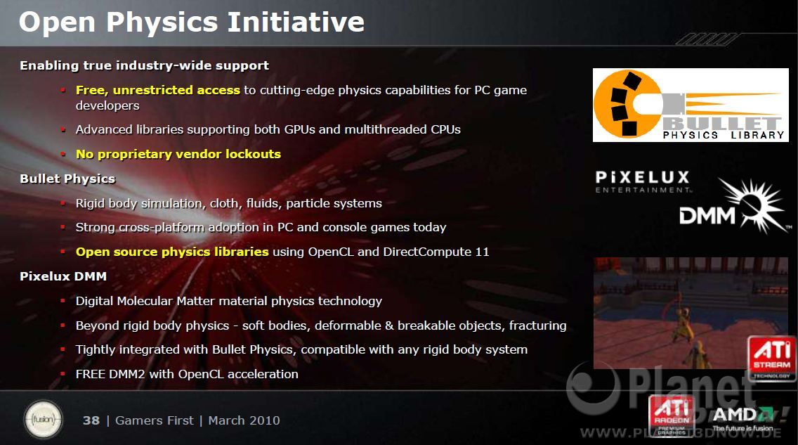 Das nach der Übernahme von ATI finanziell angeschlagene AMD dementierte im November 2007 Interesse an Ageia, dem zweiten großen Physikengine-Hersteller, zu haben. Nvidia dagegen machte im Februar 2008 Nägel mit Köpfen und gab die Übernahme des PhysX-Entwicklers Ageia bekannt. Ziel des Kaufes war es, PhysX auf die eigene proprietäre CUDA-Schnittstelle zu portieren. Seit dem GeForce 177.39 können alle GPUs von Nvidia ab der GeForce 8000 Serie zur Physikbeschleunigung genutzt werden. Vorraussetzung ist aber eine Unterstützung durch das jeweilige Spiel. Nvidia verstand es in der Folgezeit durch geschicktes Marketing PhysX als Mehrwert der eigenen Produkte gegenüber der Konkurrenz zu vermarkten. Das führte sogar so weit, dass man AMD eine Öffnung von PhysX anbot. Dieses Angebot war aber sicherlich nicht ganz ernst zu nehmen, so sollte AMD im Gegenzug die CUDA-Schnittstelle übernehmen. AMD lehnte dankend ab, da man sich nicht in die einseitige Abhängigkeit begeben wollte. Stattdessen gab man eine engere Zusammenarbeit mit Havok bekannt. Ob im Rahmen dieser Zusammenarbeit Havok auch für die Beschleunigung mittels GPU erweitert werden soll, blieb bisher unklar. Um nicht vollständig den Anschluss bei der Physikbeschleunigung zu verlieren, zeigte AMD einige Demos. Mit dem Start der Radeon HD 5800 Serie rief man dann schließlich die eigene Open Physics Initiative aus. Zusammen mit Pixelux Entertainment sollte deren Digital Molecular Matter (DMM) System und die Open Source Bullet Physics Engine zusammengeführt und auf OpenCL bzw. Direct Compute portiert werden.