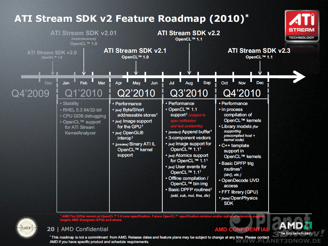 Im offiziellen OpenCL Entwicklerforum von AMD ist eine Roadmap für die Weiterentwicklung des ATI Stream SDK aufgetaucht. Demnach wird die nächste Version im August 2010 erscheinen und erstmals die Unterstützung für den erst kürzlich verabschiedeten OpenCL 1.1 Standard mit sich bringen. Damit werden einige Features, die bisher nur als Extension angeboten wurden, fester Bestandteil von OpenCL. Leider zählt dazu aber auch weiterhin nicht die Unterstützung von Berechnungen mit Gleitkommazahlen doppelter Genauigkeit. AMD bietet zwar bereits heute eine entsprechende Extension an, allerdings können damit aktuell nur einfache Additionen, Subtraktionen und Multiplikationen auf der GPU ausgeführt werden. Wenn man komplexere Berechnungen mit doppelter Genauigkeit durchführen will, muss derzeit auf die CPU-Implementierung von OpenCL bei AMD zurückgegriffen werden. Im August sollen weitere Basisoperationen und im Dezember dann endlich auch erste Trigonometrische Funktionen hinzukommen. Zusammen mit der „FFT library“, mit der Funktionen zur Berechnung der Fast-Fourier-Transformation bereitgestellt werden, wird die OpenCL Umsetzung von AMD langsam auch für wissenschaftliche Projekte interessant. Außerdem plant man im Dezember die Veröffentlichung einer ersten Beta-Version des OpenPhysics SDK, was wohl AMDs Gegenstück zu Nvidias PhysX SDK werden soll. Damit kann man ein Jahr nach der Ankündigung der Open Physics Initiative erste Ergebnisse vorzeigen. Welche neuen Features sonst noch geplant sind, kann dieser Folie entnommen werden: