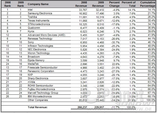 Das Marktforschungsunternehmen ISuppli hat die Umsatzzahlen der Top 25 Chip-Hersteller für das Jahr 2009 veröffentlicht. In den Zahlen spiegelt sich natürlich auch die Weltwirtschaftskrise wider. So sanken die Gesamtumsätze der Branche um 11,7 % auf 229,917 Milliarden US-Dollar. Innerhalb der Top 25 konnten nur 4 Unternehmen den Umsatz gegenüber dem Vorjahr steigern. Alle anderen hatten mit zum Teil stark rückläufigen Umsätzen zu kämpfen. Am schlimmsten hat es dabei Sony erwischt, deren Umsatz um 35,7 % einbrach. An der Spitze thront natürlich auch weiterhin Intel mit 32,410 Mrd. US-Dollar (-4,0 %), was 14,1 % des Gesamtumsatzes der Branche entspricht. Auf den Plätzen 2 und 3 folgen dem Branchenprimus abgeschlagen Samsung Electronics und Toshiba. Mit einem leicht rückläufigen Umsatz von 5,207 Mrd. US-Dollar (-4,6 %) belegt Advanced Micro Devices den 8. Platz. Damit ist es AMD immerhin gelungen in wirtschaftlich schweren Zeiten in die Top10 zurückzukehren. Beim Grafikspezialisten nVidia brachen die Umsätze stärker ein. Mit 2,826 Mrd. US-Dollar (-12 %) belegt man Platz 21. Als einziges Unternehmen konnte MediaTek seine Umsätze deutlich steigern. Mit einem Plus von 22,6 % auf 3,551 Mrd. US-Dollar schnellte man in der Rangliste vom 24. auf den 16. Platz hoch.