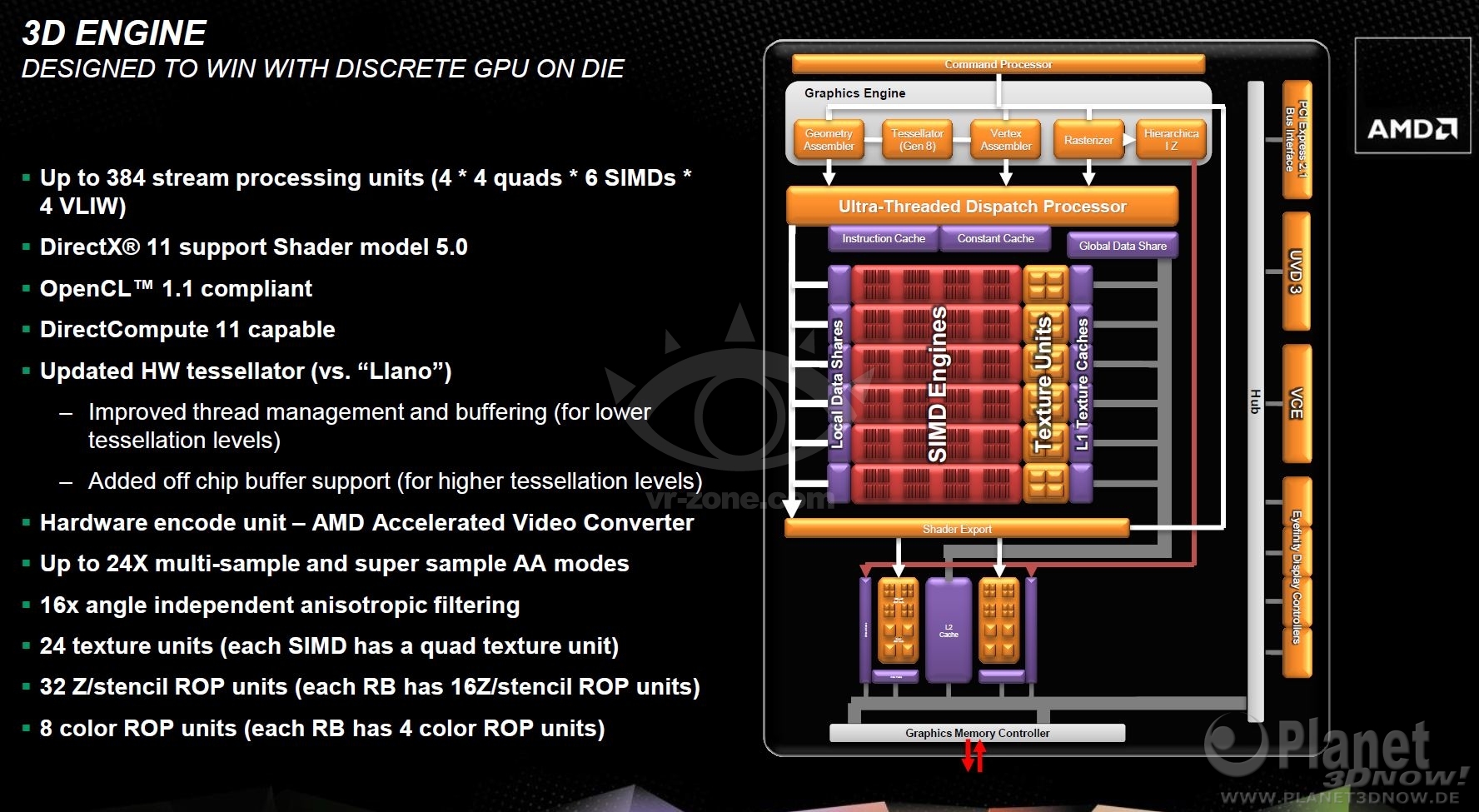 Nicht viel Neues gibt es vom Grafikteil der neuen APU zu berichten. 384 Shader nach der altbekannten VLIW4-Bauart, die erst- und einmalig in der HD6900-Generation eingesetzt war. Eine APU mit den neuen GNC-Architektur gibt es erst nächstes Jahr unter dem Codenamen Kaveri. Interessant ist vielleicht ein Detail: Laut obiger Folie unterstützt die APU Off-Chip-Speicher, wodurch die Tessellation-Leistung gesteigert wird. Dabei handelt es sich aber um keinen extra Chip, sondern nur um einen Speicherbereich im normalen RAM. Oben rechts im Eck des Bildes sieht man auch die unterstützte PCIe Version. Leider scheint Trinity nur mit PCIe 2.1 und nicht schon mit PCIe 3.0 zu kommen - sofern es sich nicht um einen Copy/Paste-Fehler handelt. Wie schon der Vorgänger Llano hat auch Trinity 24 PCIe-Leitungen.