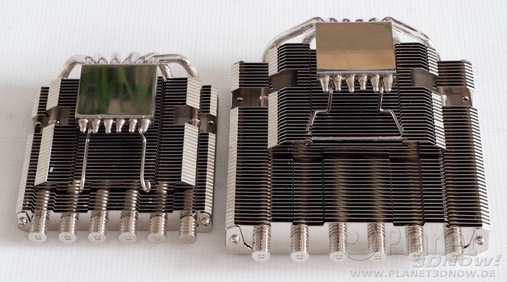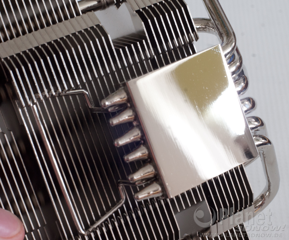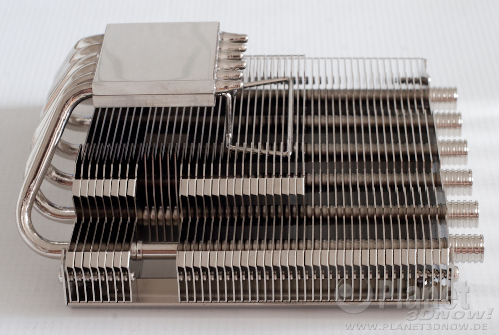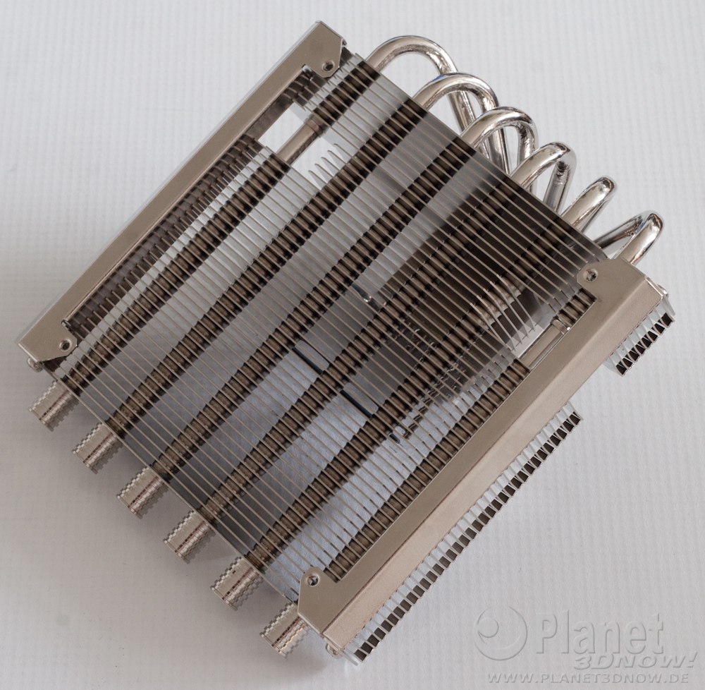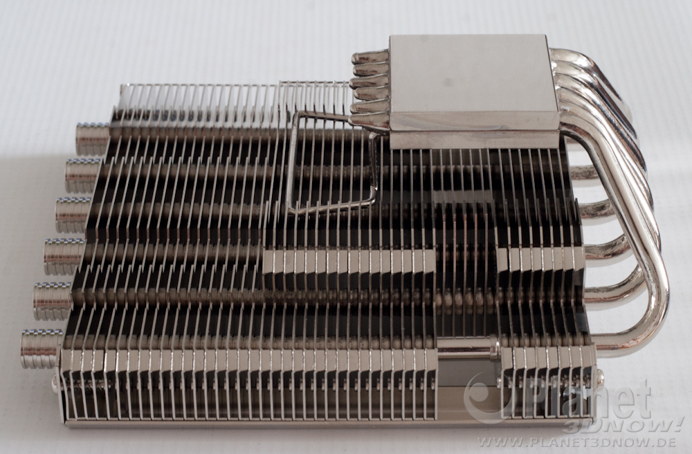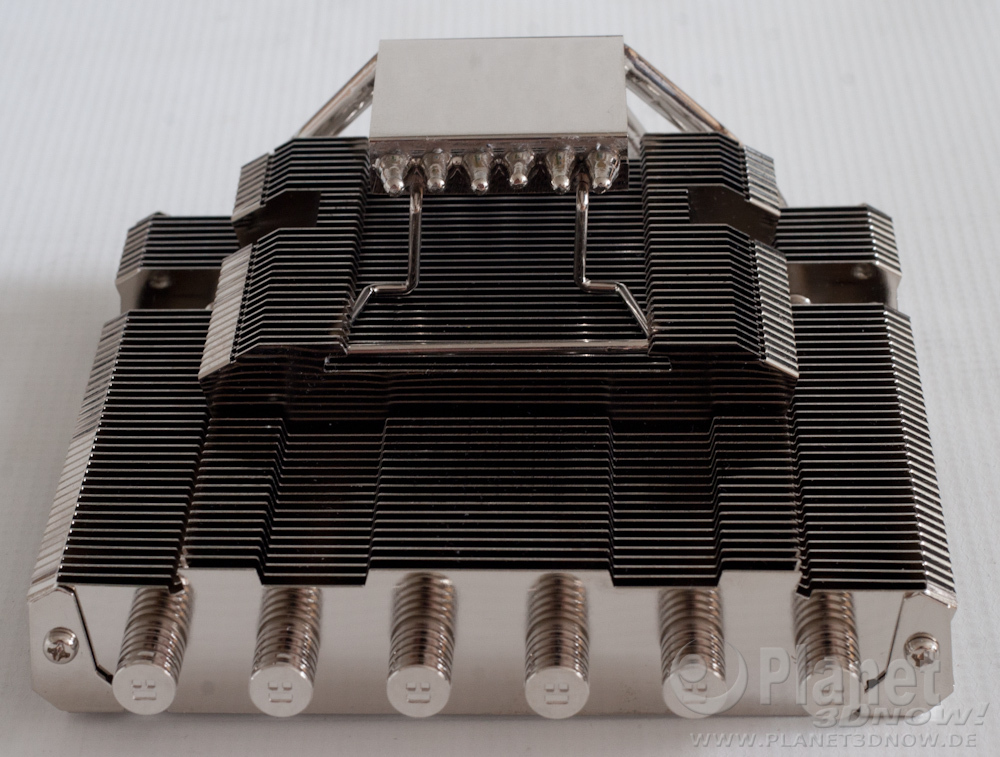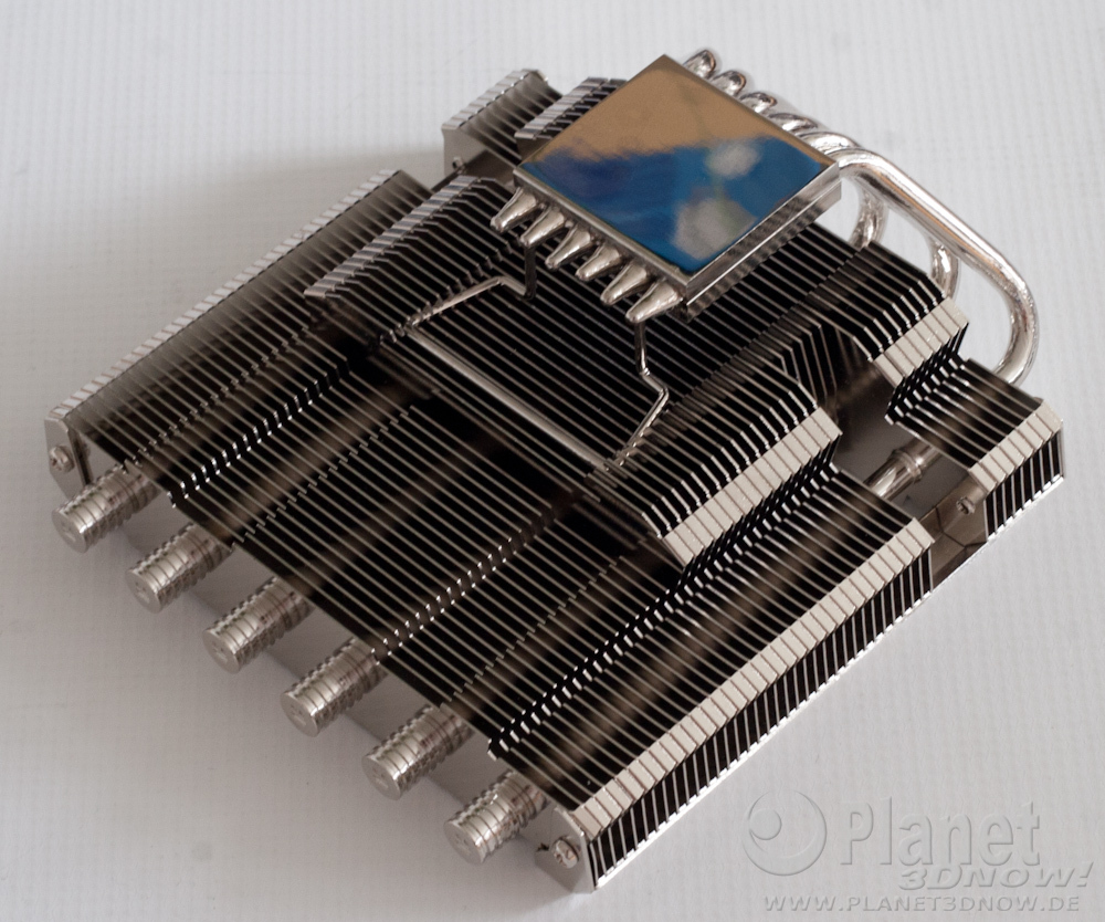 Der Aufbau des Thermalright AXP-200 ist identisch zum bekannten AXP-100. Der 60 mm hohe Kühlkörper verfügt über sechs Heatpipes. Auf die Heatpipe-Direct-Touch-Technologie verzichtet der Hersteller. Stattdessen sehen wir einen vernickelten Kühlerboden, in dem die Heatpipes verlötet sind. Der walzengefräste Boden weist im Normalfall eine höhere Oberflächenrauhigkeit auf, wird aber durch die Vernickelung sozusagen geglättet.