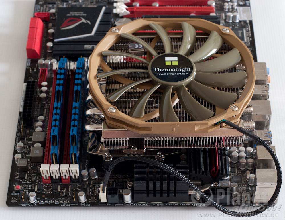 Anstatt sich für die Stabilität nur auf die Heatpipes zu verlassen, kommt zusätzlich ein Stützbügel zum Einsatz. Die durch den Boden aufgenommene Wärme wird über die Heatpipes an die Lamellen weitergegeben. Wie man sehen kann, sind die Lamellen unterschiedlich hoch. Dadurch garantiert Thermalright bei den verschiedenen Montagerichtungen, dass keine Bauteile mit dem Kühler kollidieren. Gerade RAM-Module oder aufwändige Kühlkonstruktionen können öfter einmal Probleme machen, wir haben damit nicht zu kämpfen.