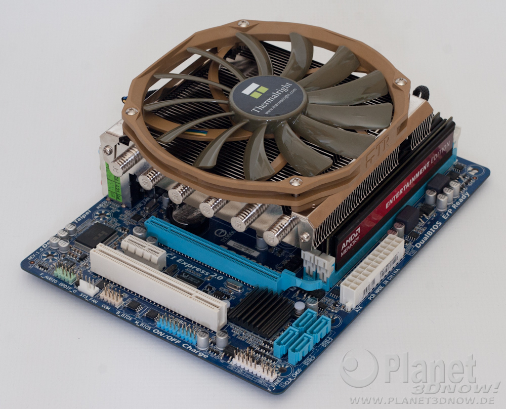 Die Montage ist identisch zur Montage des Thermalright AXP-100. Die Backplate wird mit den passenden Schrauben versehen und die Isolationsringe aufgelegt. Nachfolgend legt man das Mainboard ohne originale AMD-Halterung auf die Thermalright-Backplate. Die Schrauben schauen nun durch die Sockel-Bohrungen. Dann werden die AMD-Abstandshalter aufgeschraubt. Danach ist der Montagerahmen einzuspannen. Der Kühler selbst kann in jegliche Richtungen gedreht montiert werden. Die Spannung ist variabel und kann durch die Schrauben eingestellt werden.