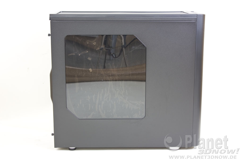 Das linke Seitenteil wurde im Vergleich zum ersten Arc Midi mit einem getönten Fenster ausgestattet, das einen Blick auf die eingebauten Komponenten gewährleistet. Da das Arc Midi R2 speziell auf den Einbau einer Wasserkühlung ausgerichtet ist, garantiert dies einen schicken Anblick. Das rechte Seitenteil ist ohne weitere Funktion. Beide Seitenteile sind mit Rändelschrauben befestigt und besitzen auf der Rückseite einen Griff, um sie besser lösen zu können.