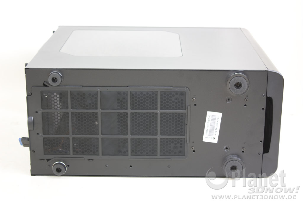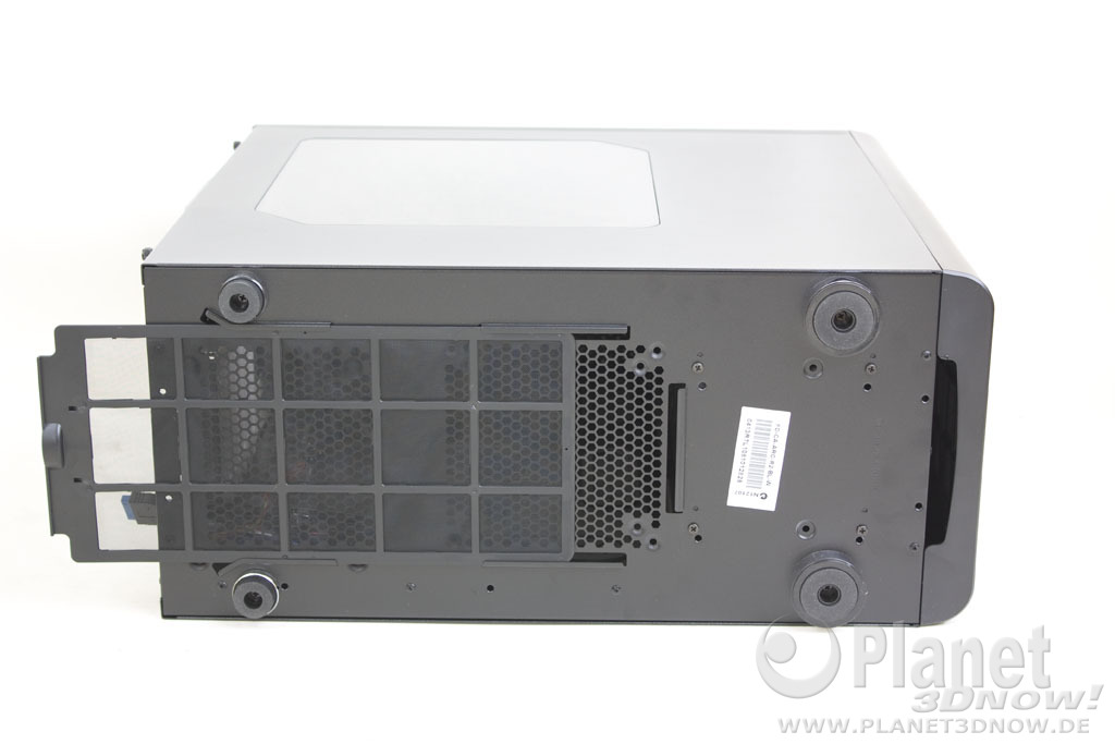 Das Netzteil wird im Arc Midi R2 auf dem Gehäuseboden befestigt. Damit es keinen Staub von unten einsaugt, ist die Unterseite mit einem Staubfilter versehen, der sich bequem nach hinten herausziehen und bei Bedarf reinigen lässt. Der Staubfilter ist groß genug, um auch einen optionalen Lüfter im 120-/140-mm-Format, der vor dem Netzteil eingebaut werden kann, vor Staub zu schützen. Zur Entkopplung vom Boden sind die Füße im HiFi-Design mit einer Moosgummiunterlage versehen.