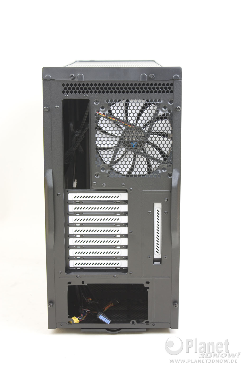 Kommen wir zum Schluss noch zur Rückseite, bevor wir uns das Arc Midi R2 von innen ansehen. Unterhalb des Deckels befinden sich einige Luftauslässe, darunter ist der letzte der drei vorinstallierten 140-mm-Lüfter befestigt. Für Erweiterungskarten stehen sieben Einbauplätze zur Verfügung. Die senkrechte Slotblende rechts ist noch ein Relikt aus der Zeit, in der Fractal Design die Lüftersteuerung über eine Slotblende auf der Gehäuserückseite realisiert hatte. Dies ist zum Glück Geschichte, da es doch sehr umständlich war, zum Regeln der Lüfter jedes Mal hinter das Gehäuse zu greifen. Das Netzteil sitzt wie bereits erwähnt auf dem Gehäuseboden.