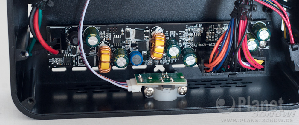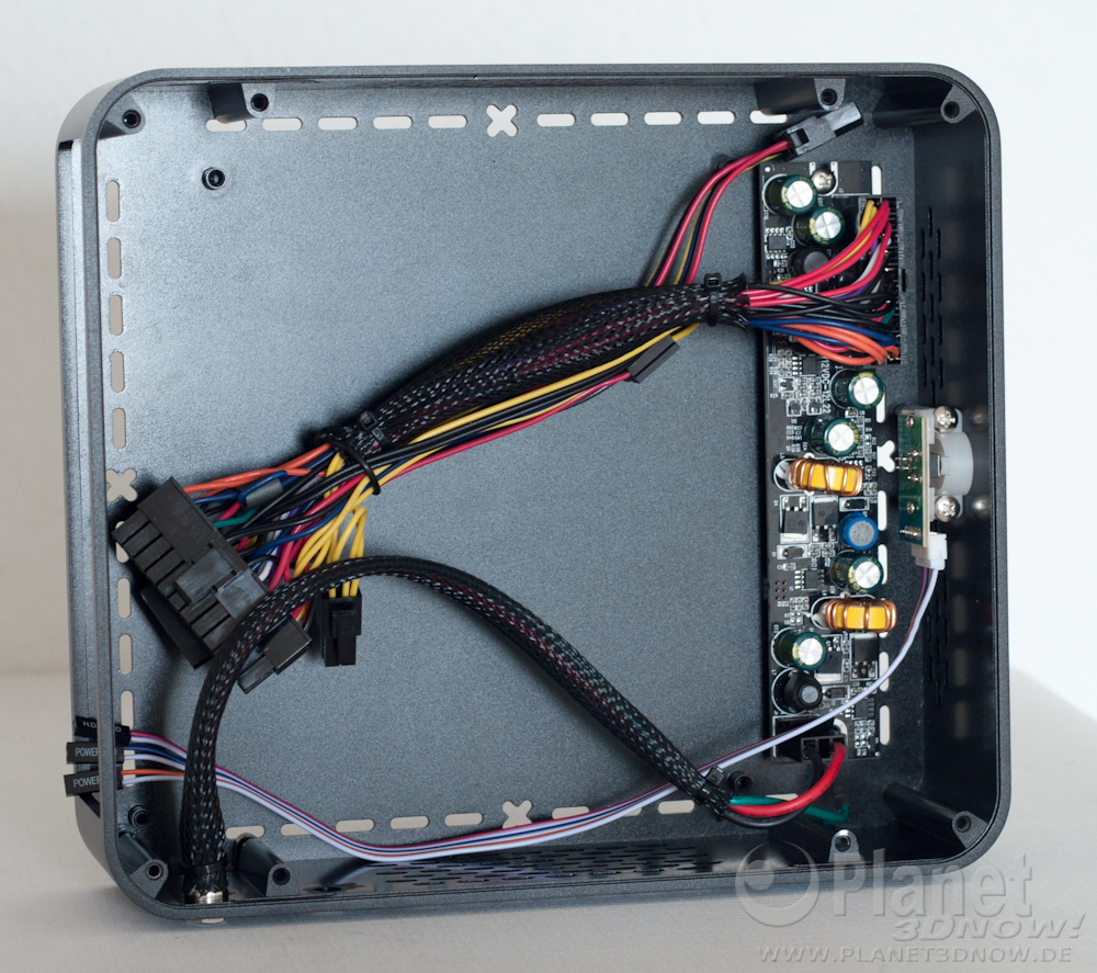 Wie beim E‑i7 sehen wir die Wandlerplatine hinter der Front des Gehäuses. Überraschend ist, dass die Platine bis auf die Seriennummer identisch zu dem Modell im E‑i7 zu sein scheint. Laut Aufschrift soll auch das hier verbaute Modell für bis zu 120 Watt gewappnet sein, auch wenn das mitgelieferte Netzteil nur 60 Watt liefert und wohl kaum jemand so viel Leistung in das kleine Gehäuse stecken möchte. Die Wandlerplatine ist wie schon gesagt identisch zu der des E‑i7, was auch bedeutet, dass die Steckerkonfiguration gleich ist. Damit benötigt man für ein zweites SATA-Laufwerk im Gehäuse einen Adapter.