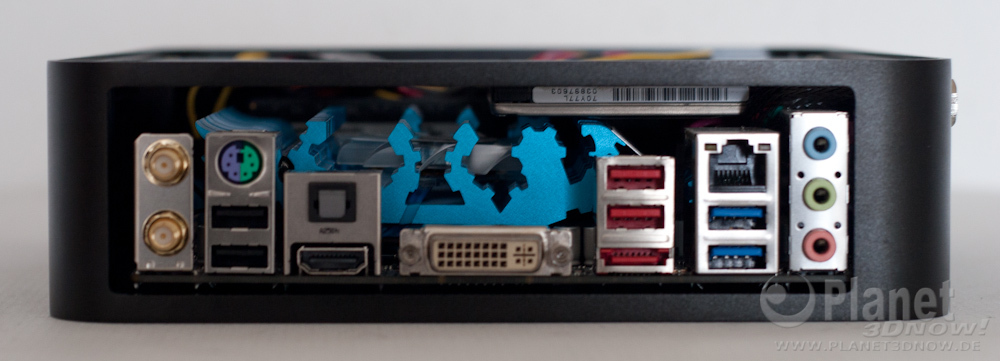 Zwischen dem Kühlkörper des ASUS-Mainboards und der Festplatte ist nur ein Spalt von etwa 1–2 Millimeter übrig. Auch wenn man einen sehr flachen Kühler im Handel finden sollte, muss man sagen, dass die Nähe von Kühler und Festplatte auf Dauer nicht praktikabel ist. Demzufolge raten wir zu einem System mit einer geringen Abwärme, wie etwa eine hier gezeigte E‑Serie-APU von AMD oder mit Intels Atom als Basis.