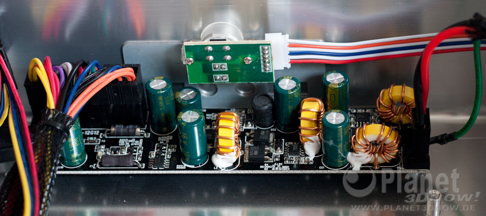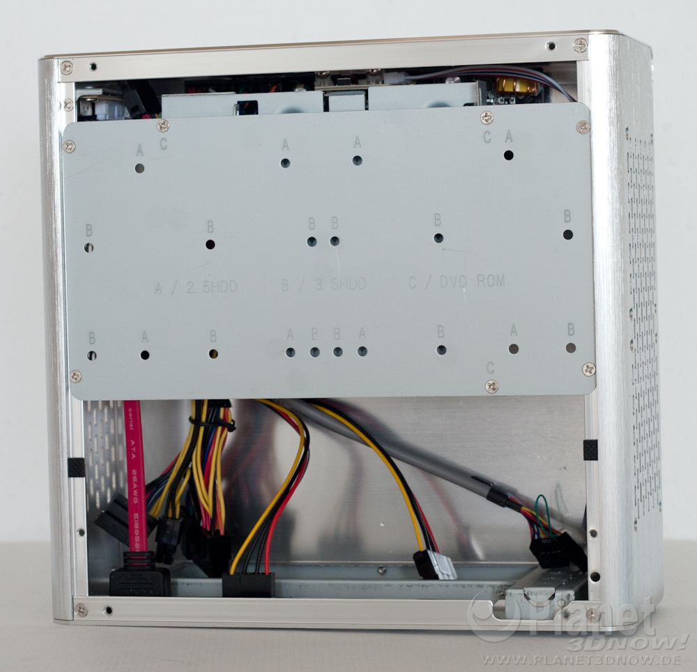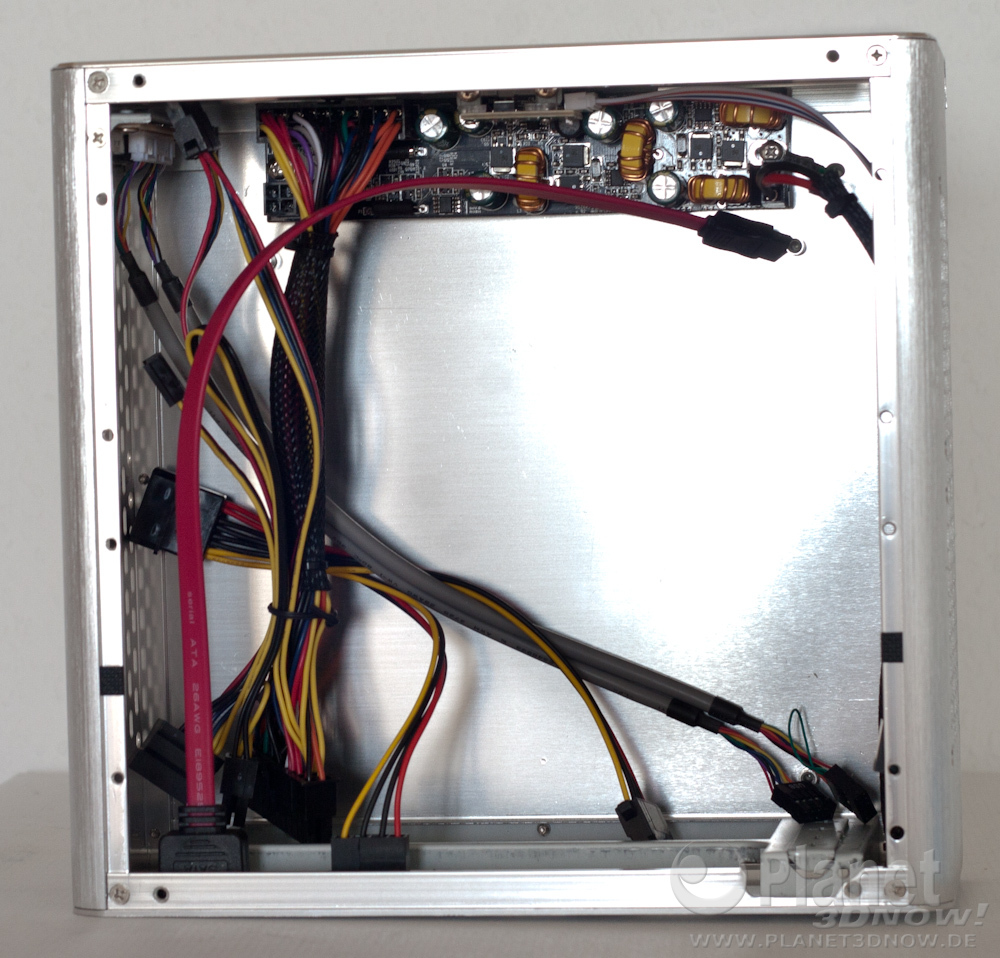 Nach dem Entfernen des Laufwerkshalters kommt die Wandlerplatine zum Vorschein. Auf dem PCB findet sich die Modell-Bezeichnung LR1005-120W12VDC-12G12. Daraus (und aus den Herstellerangaben) lässt sich ableiten, dass theoretisch sogar ein stärkeres externes Netzteil mit maximal 120 W Leistung genutzt werden könnte. Wie sich das mitgelieferte 84 W starke Modell im Vergleich zur Konkurrenz schlägt, sehen wir uns später noch an. An dieser Stelle möchten wir uns aber schon einmal die Stecker-Konfiguration hervorheben: 1x 24-pin ATX, 1x 4‑pin (EPS12V), 1x SATA, 1x 4‑pin-Molex und 1x Floppy. Heutzutage kommen im Allgemeinen fast ausschließlich SATA-Laufwerke zum Einsatz. Dementsprechend würden wir uns mehr SATA-Stecker wünschen, um auf einen Adapter verzichten zu können, wenn kein optisches Laufwerk, sondern eine zweite Festplatte verbaut wird. Aber das ist eher Meckern auf höherem Niveau, da für die Kombination von Slim-Laufwerk (benötigt sowieso einen Adapter) und einer Festplatte die Anschlüsse passend sind. Aufgrund des geringen Platzangebots muss man sich als Hersteller ohnehin entscheiden, was man ins Gehäuse packt und was nicht.